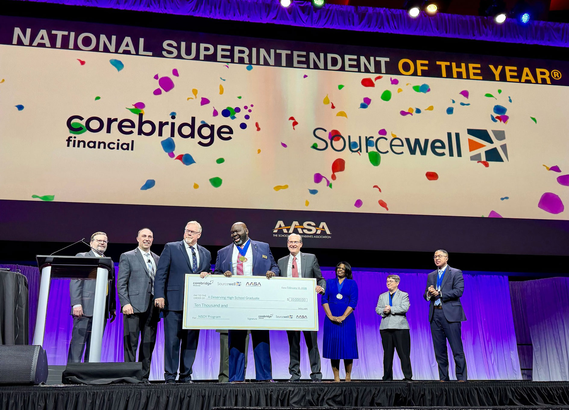 Now in its 39th year, the National Superintendent of the Year program honors leaders who go above and beyond in advancing public education in their communities. Co-sponsored by AASA, Corebridge Financial, and Sourcewell, this award celebrates superintendents who exemplify creativity, strong communication, professionalism, and community involvement.
